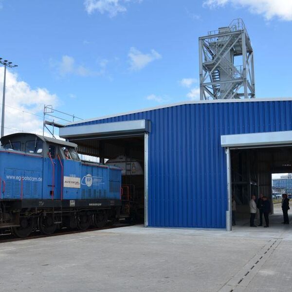Die Züge rollen Stück für Stück in die Schüttgutenladestelle und entladen die Agrargüter in den unterirdisch liegenden Bunker. Von dort aus findet die Verteilung — zunächst per Lkw — auf die umliegenden Lagerhallen statt. In einem zweiten Bauschritt werden bis Ende des Jahres Förderbänder installiert, über die der entsprechende Weitertransport automatisiert wird.