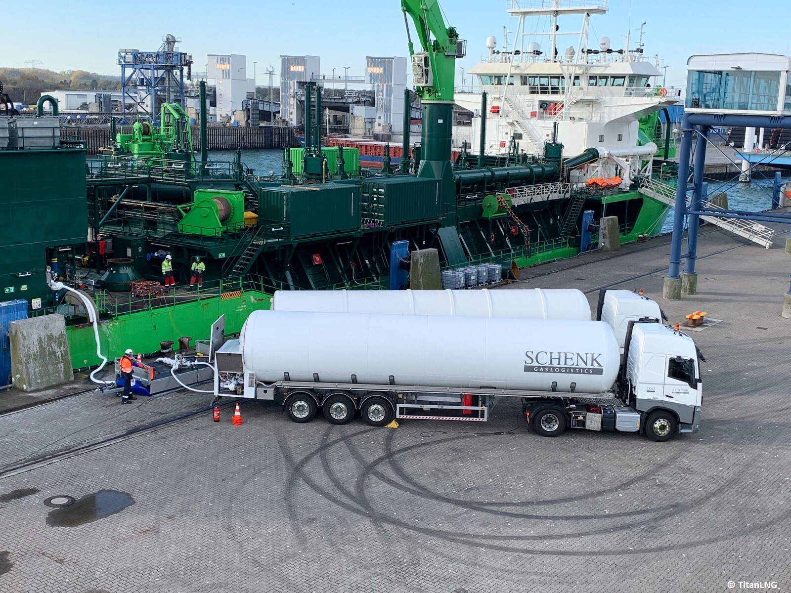The article of the Titan LNG can be found here: http://titan-lng.com/en/first-delivery-by-titan-lng-in-german-port-of-mukran-demes-dredger-scheldt-river-was-refuelled-from-7-lng-trucks/
