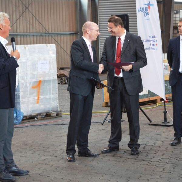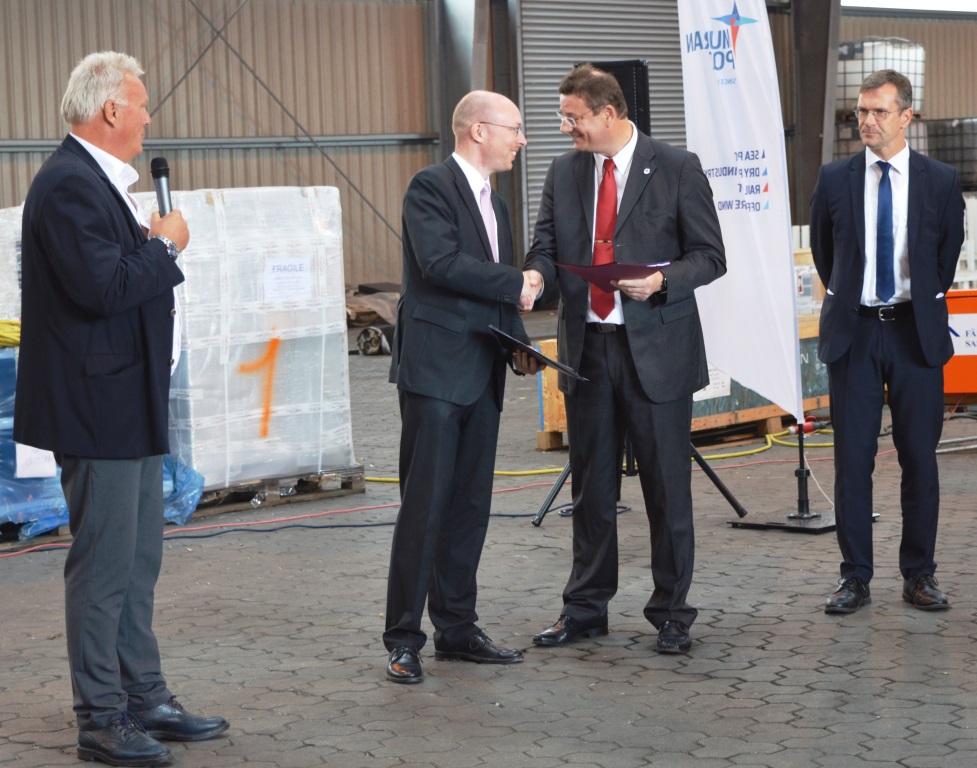 Sassnitz-Mukran, 31. Juli 2017 - Knapp viereinhalb Millionen Euro stehen im Mukran Port insgesamt für die Errichtung eines neuen Wellenbrechers und die Verlängerung der bestehenden Schüttsteinmole zur Verfügung. Der für Infrastrukturmaßnahmen in Mecklenburg-Vorpommern zuständige Minister, Christian Pegel, übergab Mitte der letzten Woche den Landes- und Bundesmittel enthaltenen Förderbescheid über fast vier Millionen Euro, der den Hauptteil der Investition ausmacht, an die Verantwortlichen der Fährhafen Sassnitz GmbH. Ebenfalls wird das Geld für die Installation von Dalben eingesetzt, die als Markierung für den Schiffsverkehr im Hafenbecken dienen.