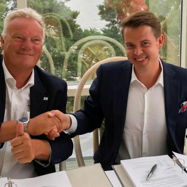 Harm Sievers (links), Geschäftsführer Mukran Port, und Thomas Hoyer (rechts), geschäftsführender Gesellschafter der Wilhelm Hoyer GmbH & Co. KG., unterzeichnen die Verträge für die Errichtung der neuen Bunkerstation im Mukran Port.