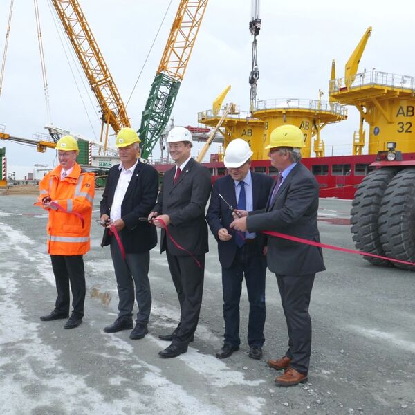 Sassnitz-Mukran, 26. Juli 2017 — Im Mukran Port fand im Beisein von Energieminister Christian Pegel die offizielle Freigabe des neuen Liegeplatzes 10 statt. Durch diesen Ausbau der Hafeninfrastruktur, der ausschließlich von regionalen Unternehmen aus Mecklenburg-Vorpommern durchgeführt wurde, sind die Bewältigung des zunehmenden Projektgeschäfts sowie die zeitgleiche Realisierung mehrerer Offshore-Wind-Projekte vom Mukran Port aus möglich. Die geschaffene Kaifläche ist mit einer Schwerlastplatte versehen, die beim Handling schwerer Komponenten – beispielsweise bei Windkraftprojekten – benötigt wird.