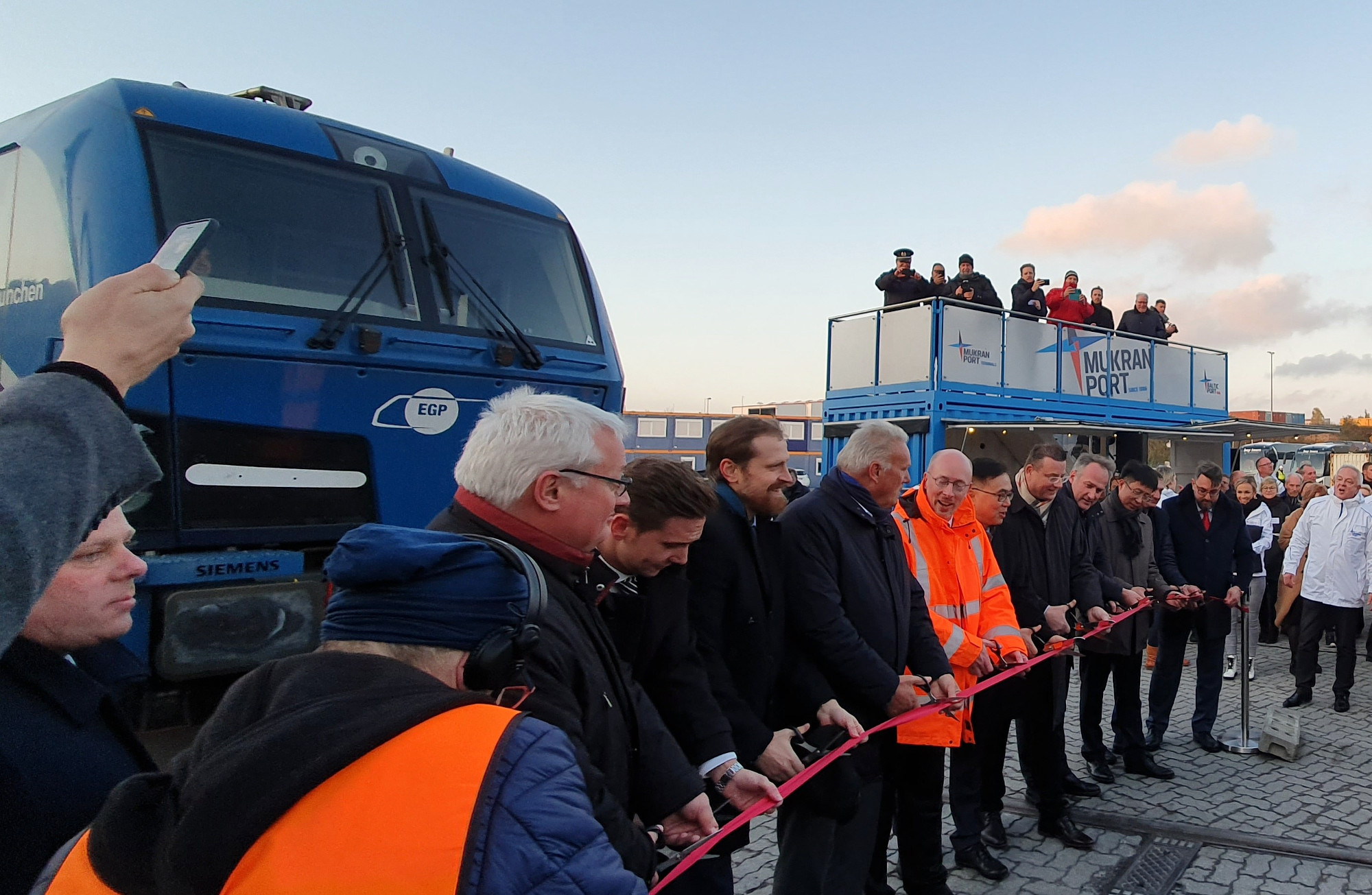 Sassnitz-Mukran, 12. November 2019 — Die ersten zwei direkten Güterzüge zwischen China und Mecklenburg-Vorpommern trafen sich am Dienstag, den 12.11.2019 im Mukran Port. Der ostgehende Zug ging mit 48 Container auf die Reise. Der westgehende 640m lange Güterzug startete seine 10.000 Kilometer lange Reise mit 42 Containern in Xi´an China über Kasachstan, Russland und Weißrussland nach Baltijsk in Kaliningrad, wo die Container auf einen Short Sea Carrier umgeladen wurden. Im Hafen des Mukran Port wurden die Container vom Schiff erneut auf Schienen verladen vom Team der Mukran Port Terminals GmbH & Co. KG. Im Mukran Port wurde dann mit allen Beteiligten der neue Korridor der chinesischen Seidenstraßeninitiative feierlich eröffnet.