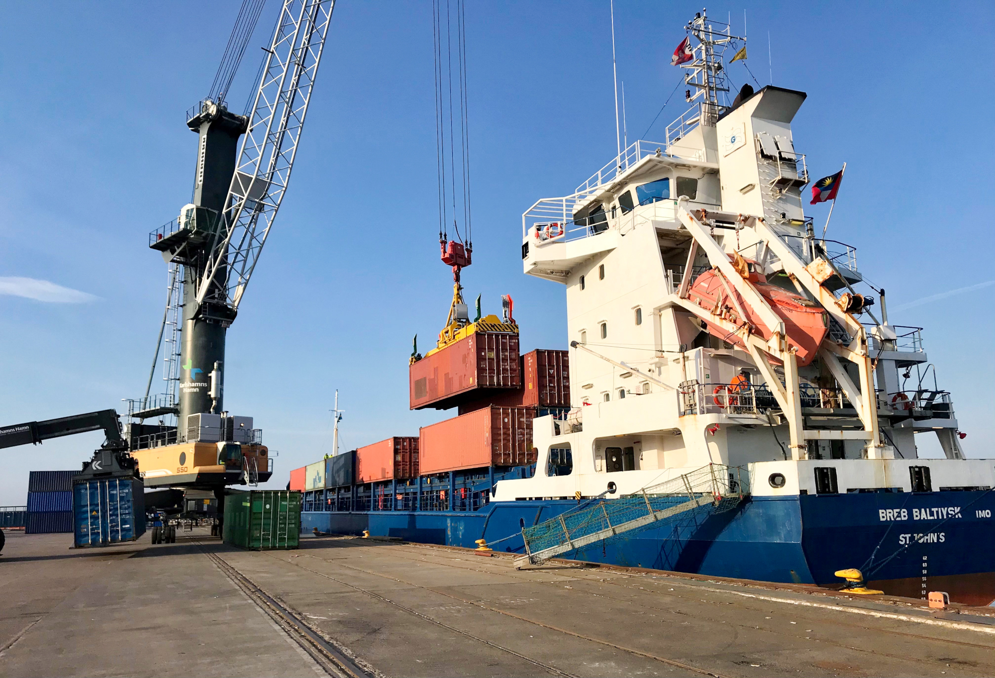 Sassnitz-Mukran, 21.04.2021 — BREB Baltiysk first time in Karlshamn transporting containers from Mukran Port for the Baltic Sea Bridge.