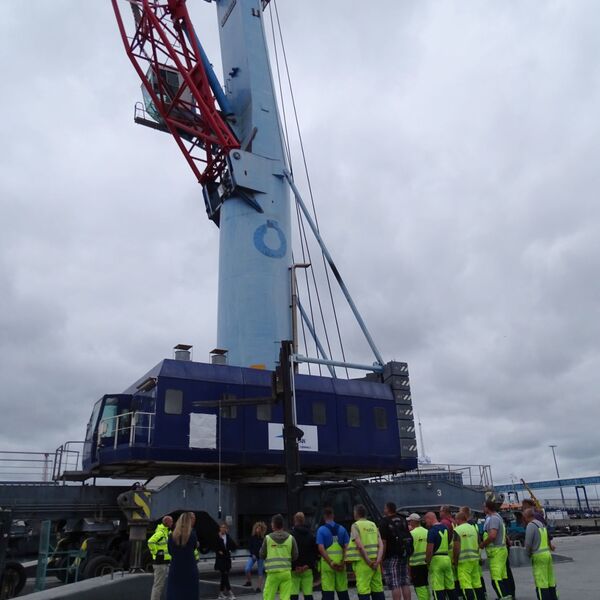 Sassnitz-Mukran, July 6, 2018 - The mobile harbor crane of the port service provider "Mukran Port Terminals" (MPT), which can handle up to 104 tonnes, was christened by managing directors Harm Sievers and Morten Lund and operational manager Christian Knappe in the presence of the entire MPT staff members yesterday.
